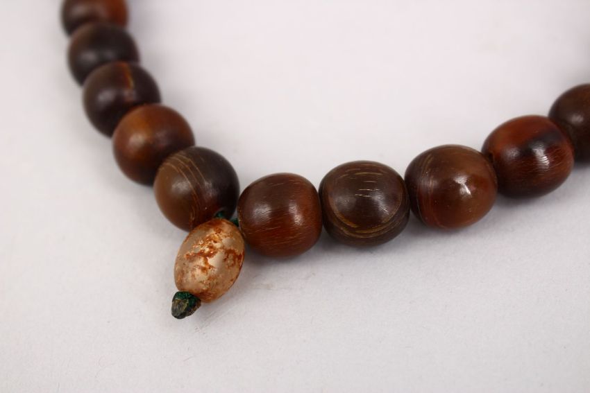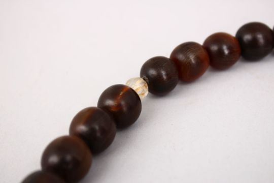A SET OF 19TH CENTURY CHINESE QING DYNASTY RHINOCEROS / RHINO HORN ROSARY BEADS / NECKLACE, comprising of 39 spherical beads and three rock crystal spacers, each bead approx 1.2cm, total approx length 60cm.