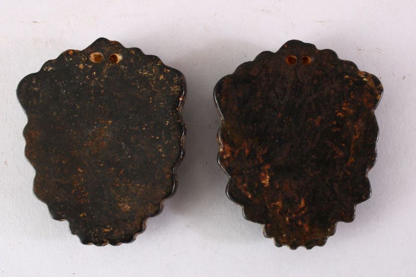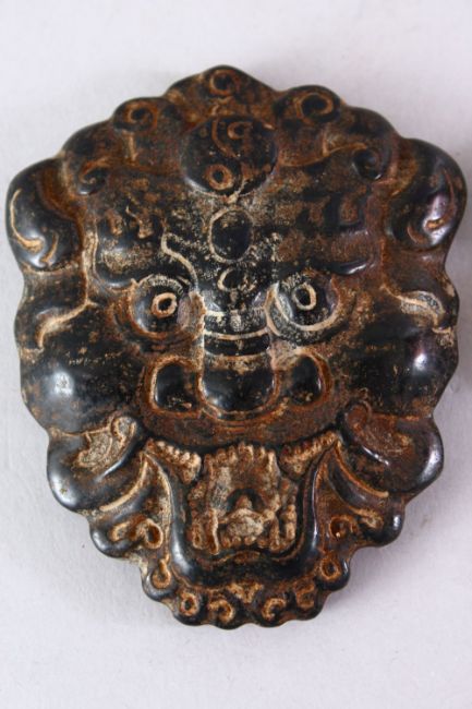 TWO TIBETAN CARVED HARDSTONE PENDANTS OF MYTHICAL MASKS, 8cm high.