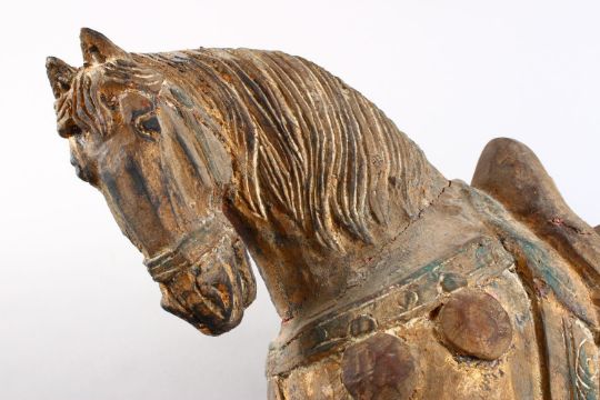 A GOOD AND LARGE CHINESE CARVED WOOD MODEL OF A STRIDING HORSE, with carved detailing and polychome decor, 80cm wide x 57cm high.