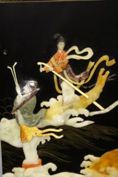A CHINESE HARDSTONE INLAID THREE SECTION IMMORTAL FOLDING SCREEN, the screen inlaid with hardstones to depict Immortal figures and flora, each section measuring 183cm x 43cm.