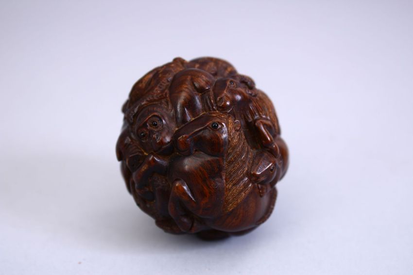 A JAPANESE LATE MEIJI PERIOD CARVED WOODEN ZOOMORPHIC ZODIAC OKIMONO , the ball carved in great detail to depict rats, hare, tigers and dragons, 5.4cm .