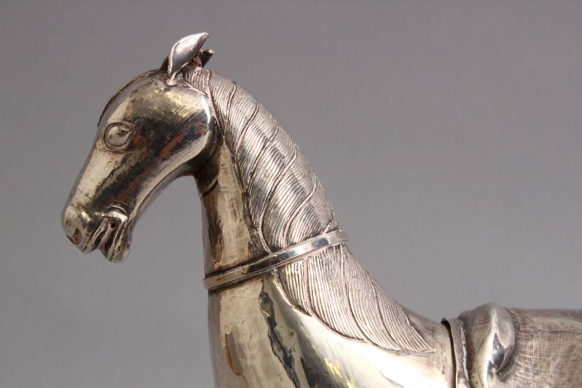 A FINE 19TH CENTURY COLONIAL OR SOUTH AMERICAN SOLID SILVER MODEL OF A HORSE, 26CM WIDE X 22 HIGH