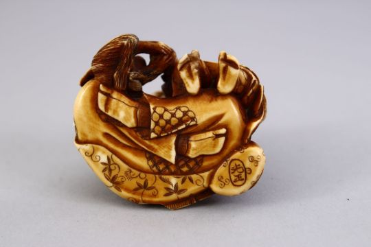 A JAPANESE MEIJI PERIOD CARVED IVORY OKIMONO - MAN & MONKEY, the seated monkey keeper seated aside his money and a female, the monkey presenting gifts to the female, artist signed to base, 5cm.