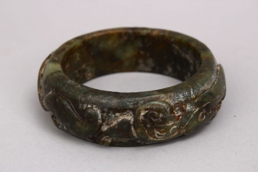 A CHINESE CARVED JADE BANGLE, carved in archaic form, 9cm