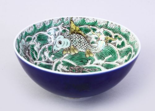 AN 18TH CENTURY KANGXI PERIOD CHINESE FAMILLE VERTE & POWDER BLUE FISH & CRAB BOWL, the interior of the bowl with decoration depicting crabs and fish amongst crashing waves, the exterior with a powder blue glaze, the base with a six character yongzheng mark, 13cm diameter. AF