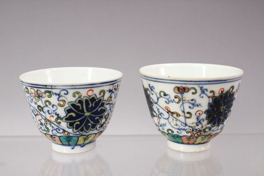 A GOOD PAIR OF CHINESE DOUCAI PORCELAIN CUPS, each decorated with scenes of formall lotus foliage, both bases with six character marks, 8cm.