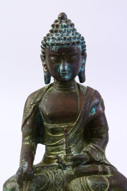 A GOOD EARLLY 17TH / 18TH CENTURY TIBETAN BRONZE FIGURE OF BUDDHA, in a seated position holding a pagoda, 26cm high x 17cm wide.