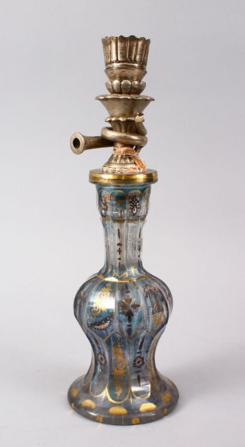 A 19TH CENTURY BOHEMIAN GILT GLASS HUQQA BASE WITH A WHITE METAL TOP, 38cm.