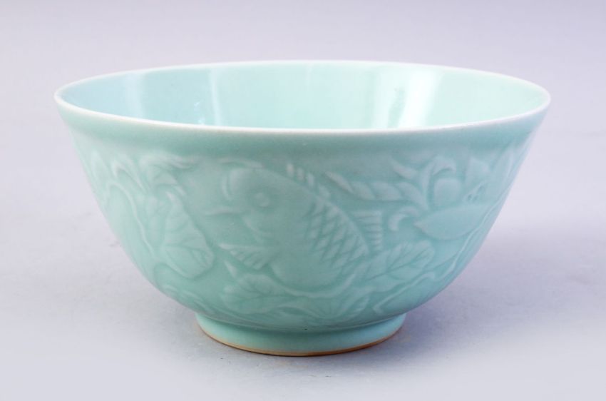 A CHINESE CELADON MOULDED PORCELAIN CARP BOWL, the bowl with carved decoration of fish and lotus, the base with a mark, 17cm.