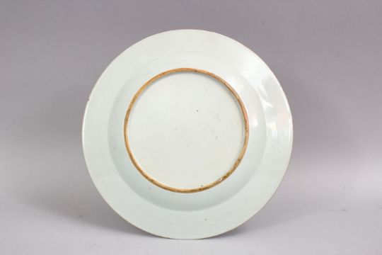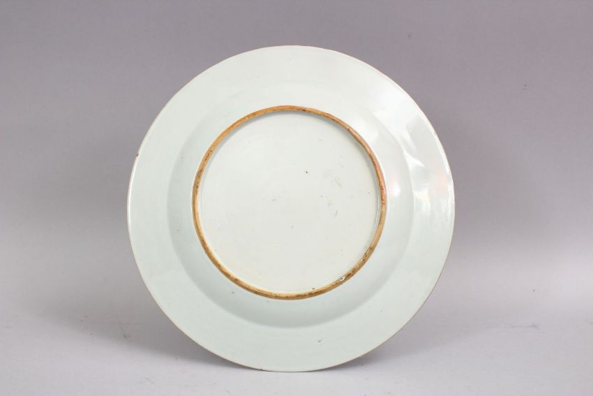 A FINE 18TH CENTURY CHINESE QIANLONG FAMILLE ROSE EUROPEAN PORCELAIN DISH, the plate decorated with nude figures in a landscape, 23cm.