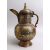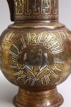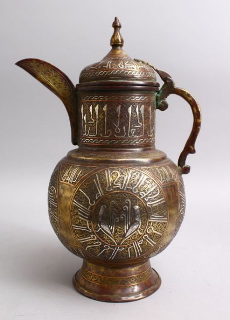 AN ISLAMIC CAIROWARE SILVER INLAID BRASS EWER WITH CALLIGRAPHY DECORATION, 36cm.