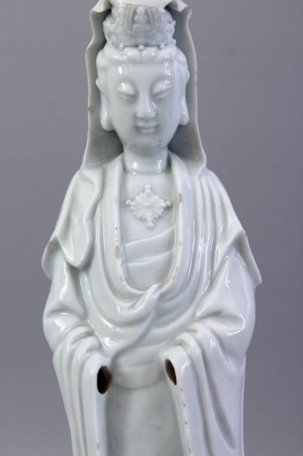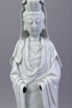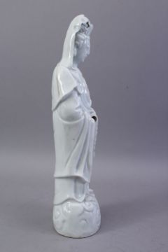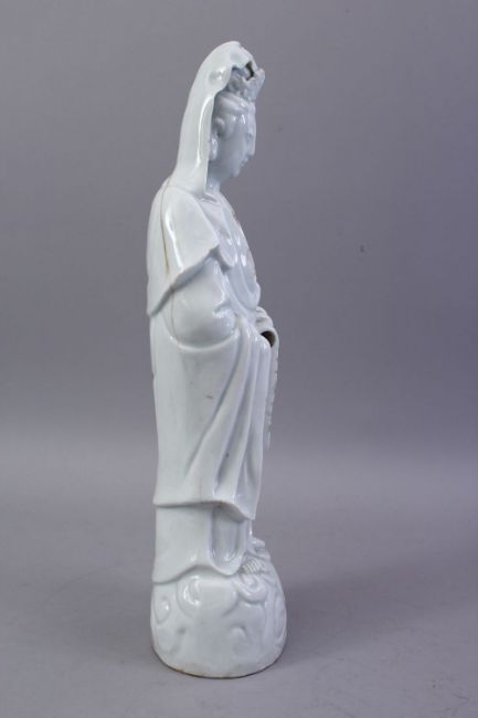 A GOOD 19TH CENTURY CHINESE BLANC DE CHINE PORCELAIN FIGURE OF GUANYING, 40CM.