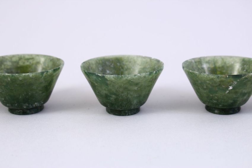 FIVE GOOD CHINESE CARVED SPINACH JADE BOWLS, 5CM.