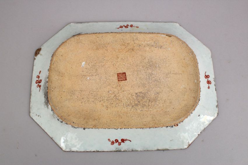 A GOOD 18TH CENTURY CHINESE FAMILLE ROSE / IMARI PORCELAIN SERVING DISH, depicting lanscape views with gilt highlights, 33cm x 24cm.