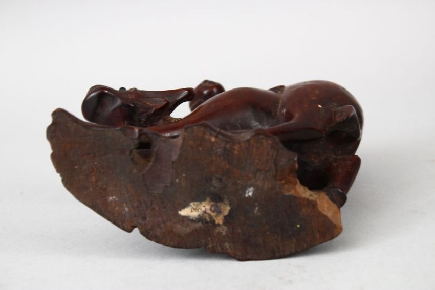 A 19TH CENTURY CHINESE CARVED CHERRYWOOD FIGURE OF AN OXEN & BOY, the boy riding upon the back of the oxen, 14cm wide x 13.5cm high.