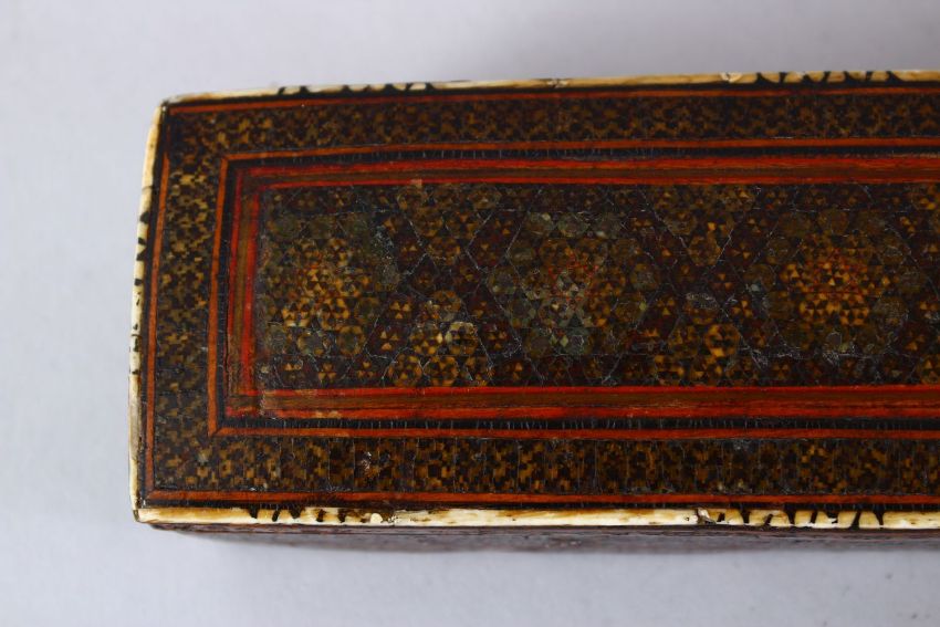 A GOOD 18TH CENTURY PERSIAN MICRO MOSAIC & LACQUER LIDDED PEN BOX, 28cm wide X 4.5cm high,