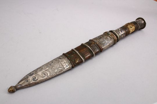 AN UNUSUAL NORTH AFRICAN NIELLO INLAID SILVER MOUNTED SIGNED DAGGER, 32cm