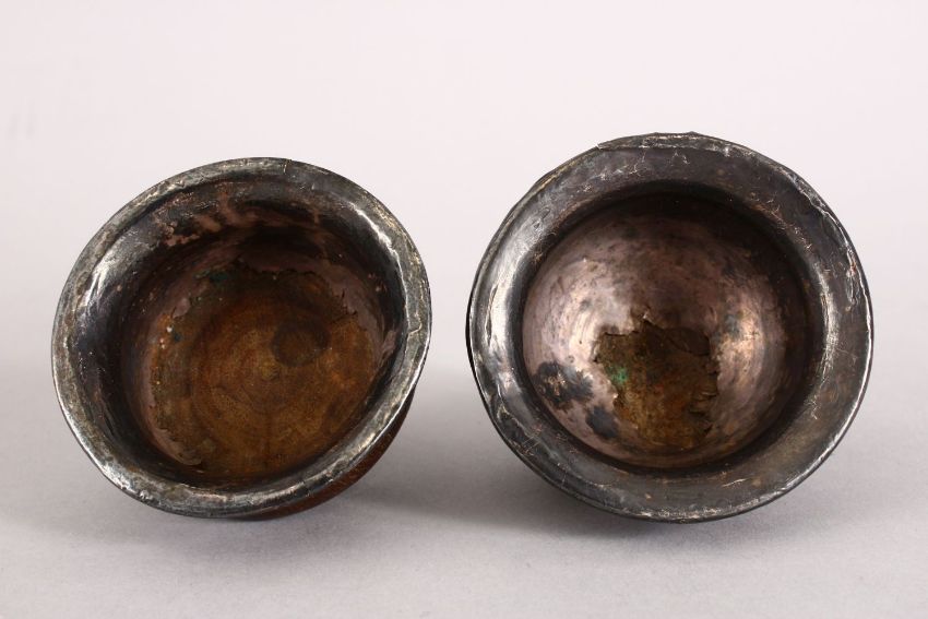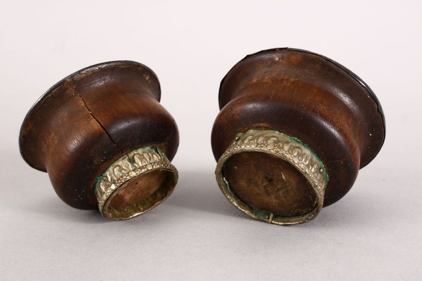 A GOOD PAIR OF 19TH CENTURY TIBETAN CARVED WOOD AND WHITE METAL WINE CUPS, both with white metal liners and foot rims, 4.4cm high x 6.5cm diameter.