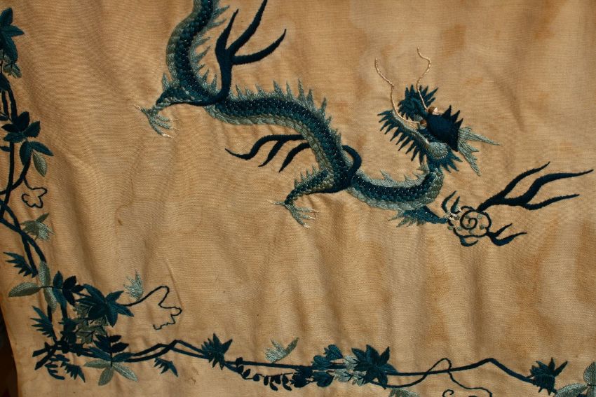 A GOOD 19TH / 20TH CHINESE EMBROIDERED SILK / TEXTILE SCROLL OF DRAGONS, the embroidery depicting one larger central dragon with the flaming pearl aside four smaller dragons with border decoration, 119cm x 116cm.