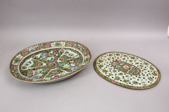 A 19TH CENTURY CHINESE CANTON FAMILLE ROSE PORCELAIN SERVING / DRAINING DISH, decorated with figures and fruits, butterflies and foliage, 46.5cm wide x 38.5cm.