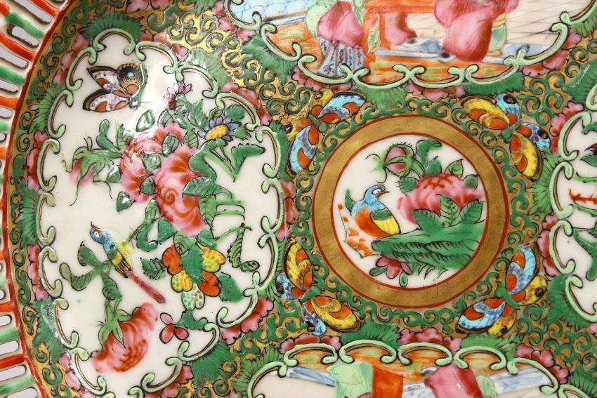 A 19TH CENTURY CHINESE CANTON FAMILLE ROSE PORCELAIN PIERCED DISH, with panel decoration of figures and birds amongst flora, 25cm