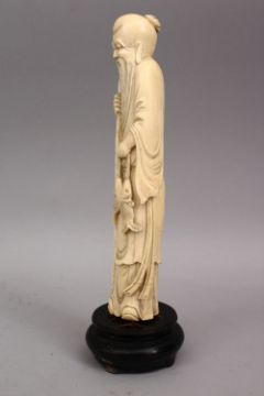 A 19TH CENTURY CHINESE CARVED IVORY FIGURE OF SHOU LAO, stoo holding twin fish upon a rope, 24cm.