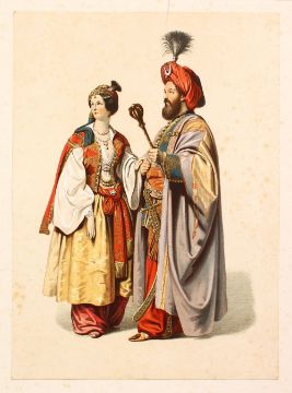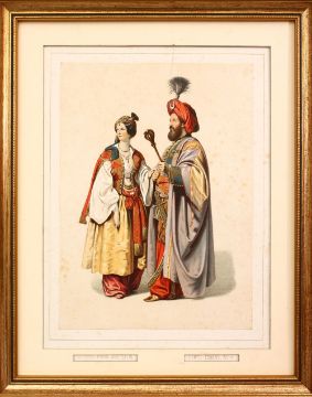 A 19TH CENTURY TURKISH FRAMED PRINT OF TWO FIGURES, 41cm x 32cm.