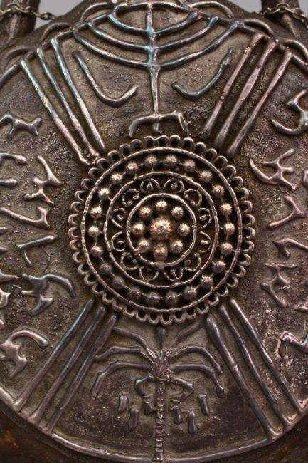 TWO GOOD BRASS & STONEWARE JEWISH RELATED ITEMS, one flask shaped stone bottle with silver inlays, with a plaque that purports to be in appreceation from the mayor of jerusalem " ehud olmert", and with a brass emblemed stand , 23cm & 22cm