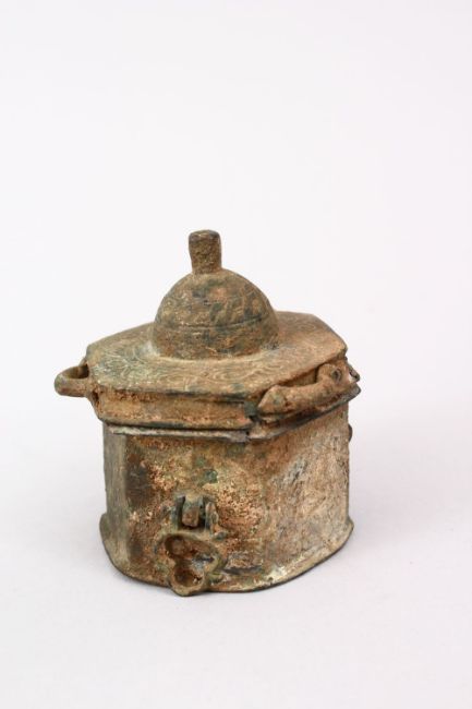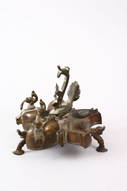 A COLLECTION OF FOUR INDIAN & PERSIAN OIL LAMPS AND A 12TH CENTURY INKWELL (4)