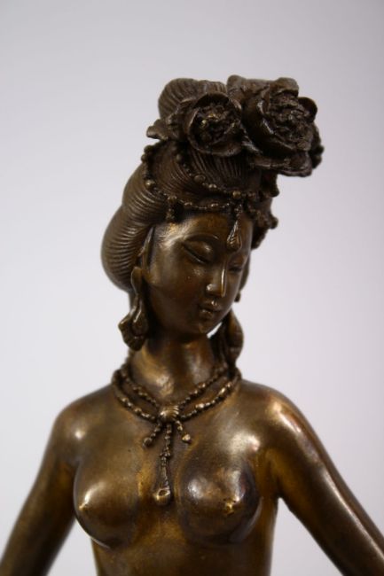 A CHINESE / ORIENTAL BRONZE FIGURE OF AN ELEGANT LADY STOOD WITHING A SHELL, 29cm X 18cm