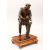 A GOOD JAPANESE MEIJI PERIOD PARCEL GILT BRONZE OKIMONO OF A WOODMAN , attributed to "Miyao Eisuke", the man working on a tree stump, in his traditional robes with gilt highlighted decoration, fixed to its original gold lacquer decorated hardwood base, 29cm high x 15cm wide.