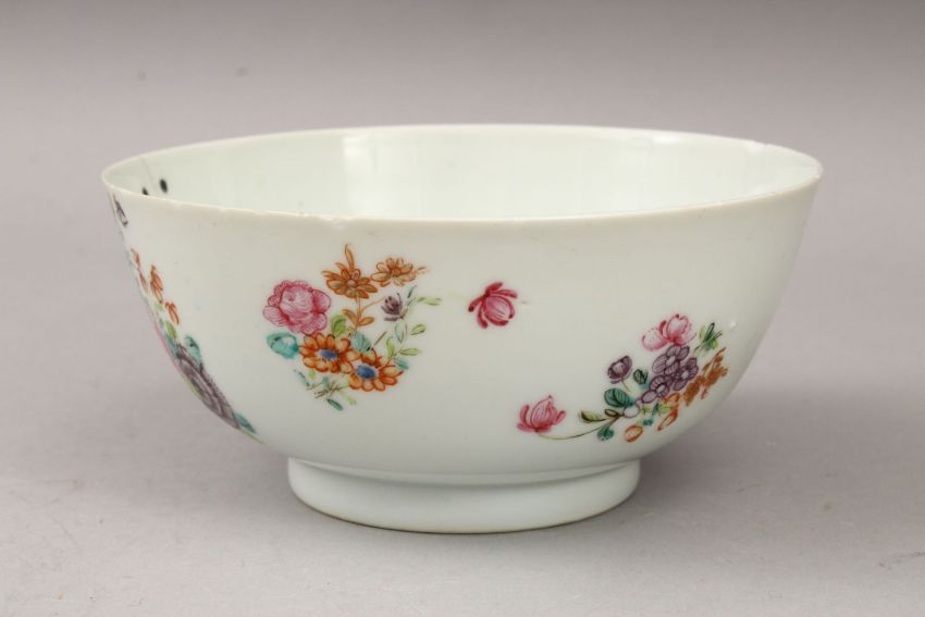 AN 18TH CENTURY CHINESE FAMILLE ROSE PORCELAIN BOWL, decorated with scenes of native flora 14cm diameter.