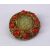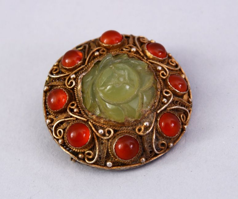 A GOOD INDIAN SILVER GILT & JADE BROOCH, with filigree work enclosing a floral carved jade centre, with red stones surrounding, stamped "silver" 3cm