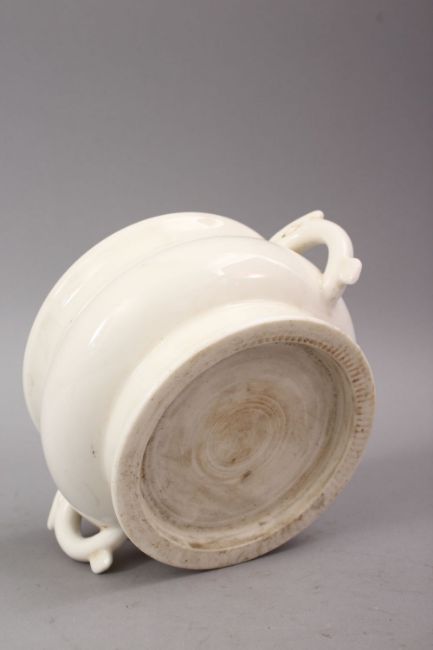 A CHINESE BLANC DE CHINE PORCELAIN INCENSE BURNER, with twin moulded handles. 17cm wide.