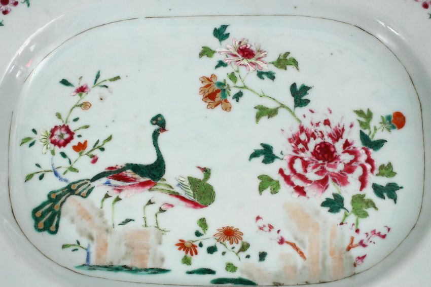 A GOOD 18TH CENTURY CHINESE FAMILLE ROSE PORCELAIN SERVING DISH, with decoration depicting peacocks amongst flora, 37cm x 28cm.