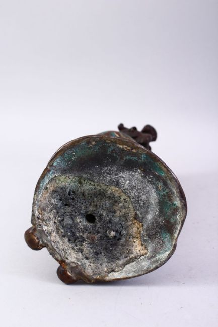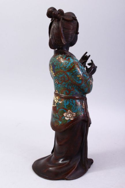 A 19TH CENTURY OR EARLIER CHINESE BRONZE & CLOISONNE FIGURE OF A WOMAN, The robes detailed in cloisonne work, the base with a filled residue, 33cm,