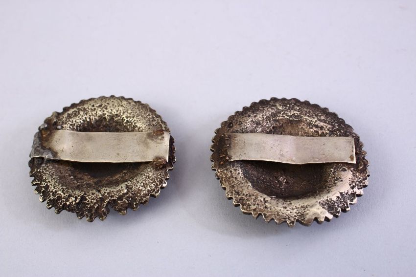 TWO OTTOMAN OR INDIAN WHITE METAL SHEILD SHAPED BOSSES, 5.5cm diameter each.