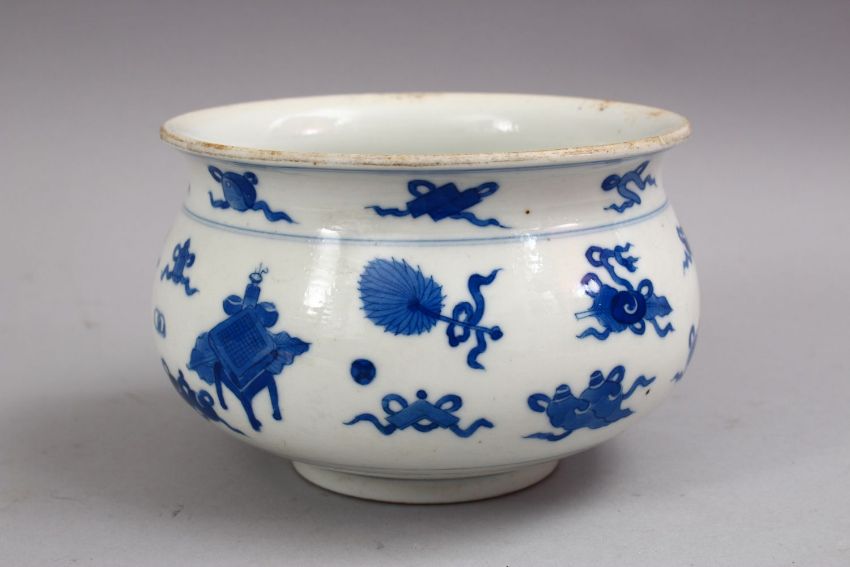 A GOOD CHINESE KANGXI STYLE BLUE & WHITE PORCELAIN BOWL, decorated with precious & buddhistic object, the base with a six character mark, 13cm.