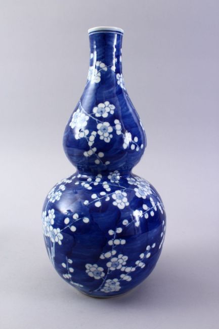 A GOOD CHINESE BLUE & WHITE DOUBLE GOURD PORCELAIN VASE, the body of the vase decorated with blossom tree decoration, the base with a four character kangxi mark, 33cm high.