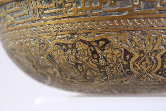 A GOOD QAJAR CALLIGRAPHIC CAST BRASS BOWL, with panels of figures and bands of calligraphy, 20cm.