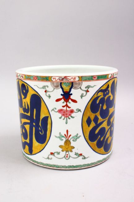 A 19TH / 20TH CENTURY CHINESE FAMILLE ROSE PORCELAIN BRUSH WAS FOR ISLAMIC MARKET, the body decorated in famille rose with panels of calligraphy, 20cm