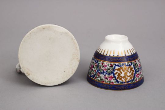 TWO GOOD ISLAMIC DECORATED PORCELAIN VASE & CUP, both similar decoration of simplistic flora, 6cm & 7.5cm