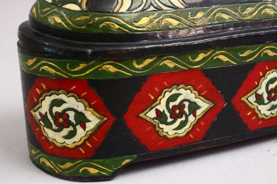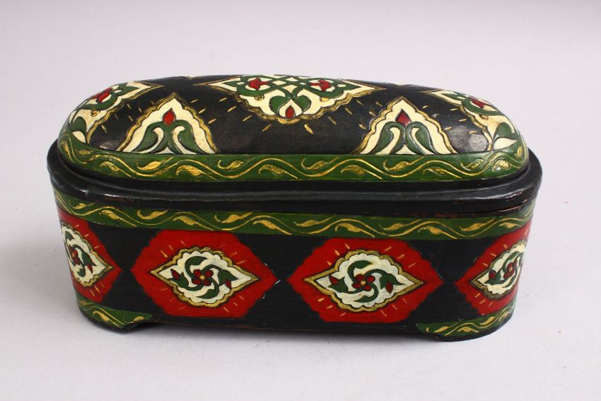 AN ISLAMIC ENAMEL COPPER LIDDED BOX, decorated with formal foliage decoration, 21cm wide.
