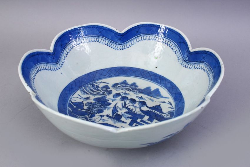 AN 18TH CENTURY CHINESE BLUE AND WHITE PORCELAIN LOBED EDGE BOWL, the bowl decorated with landscapes scenes, 24.5cm diameter.
