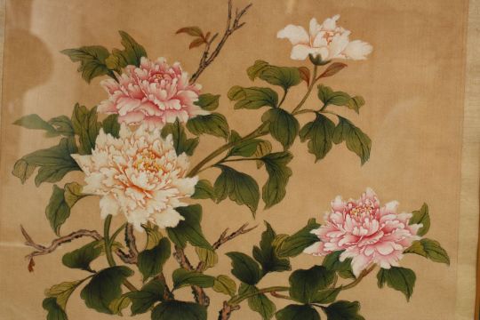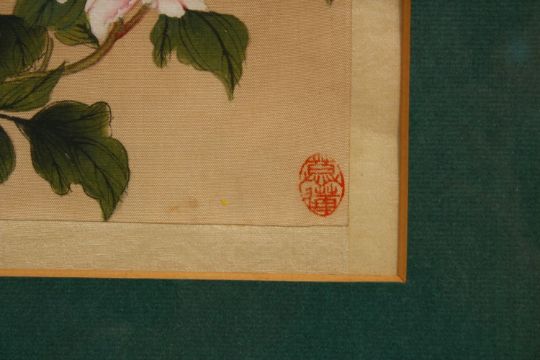 A PAIR OF JAPANESE PAINTINGS ON SILK OF FLORA, both finely painted to depict chrysanthemum decoration, each with seal marks, 47cm x 43cm