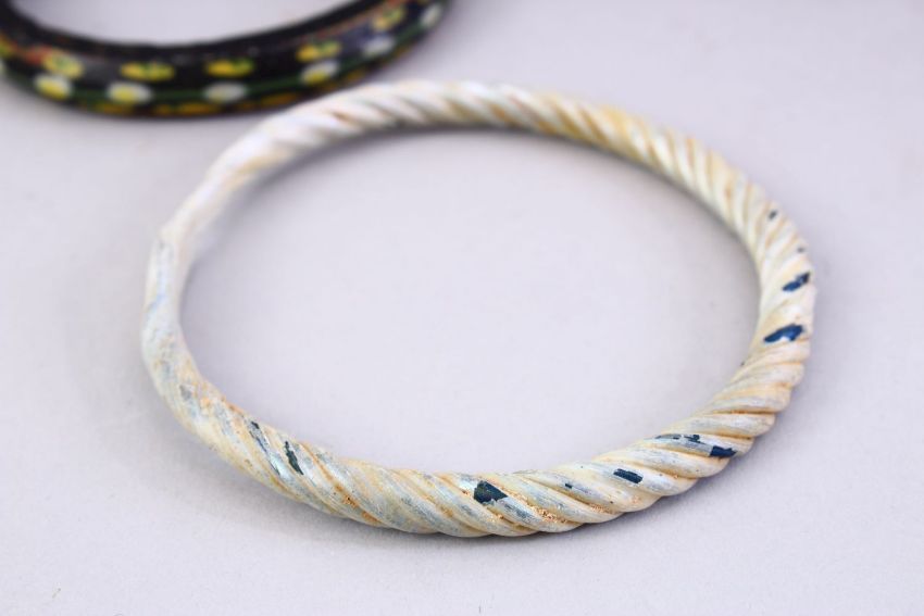 FOUR GOOD MAMLUK CARVED STONE / GLASS BRACELETS. largest 9cm.