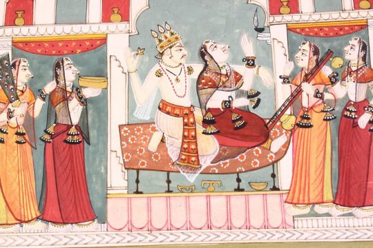 AN INDIAN MUGHAL MINIATURE MEWAR SCHOOL PAINTING , ragmala series, depicting a ing and queen seated in darbar, 25cm x 17.