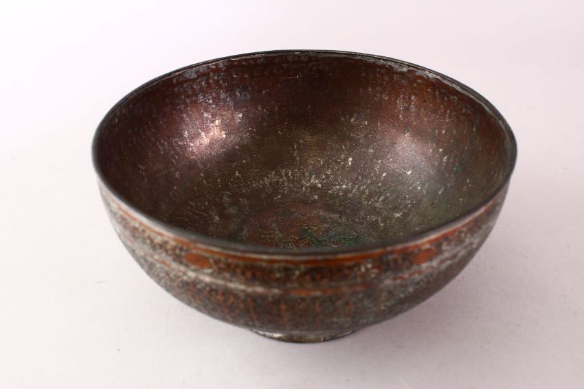 A FINE INDO PERSIAN ENGRAVED ONCE COPPER BOWL, 19.5cm diameter.