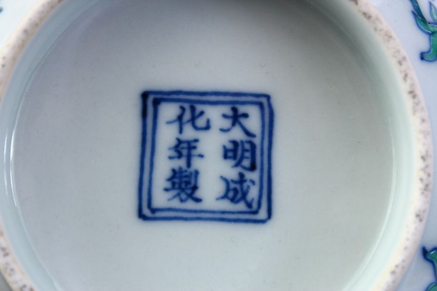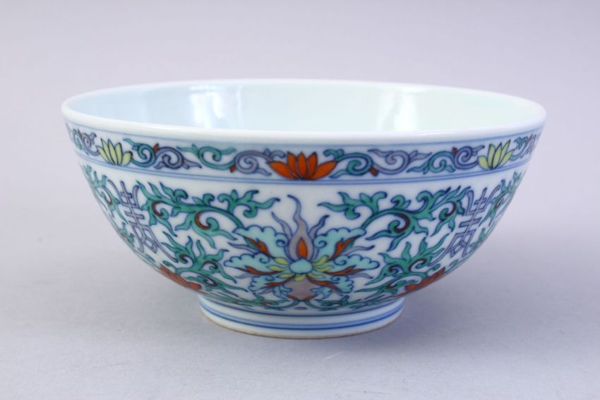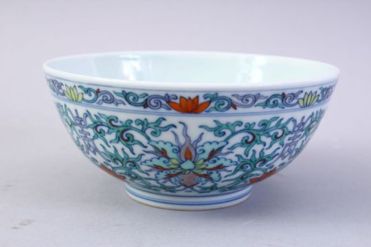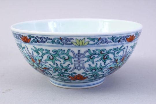A GOOD CHINESE DOUCAI DECORATED PORCELAIN BOWL, the body decorated with scenes of formal scrolling foliage and symbols, the base with a six character mark, 13cm diameter.