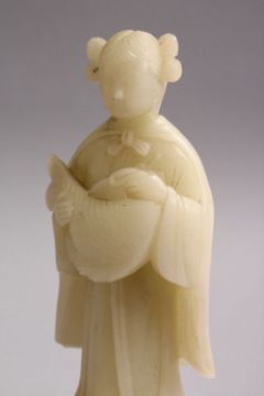 A GOOD CHINESE CARVED WHITE JADE FIGURE OF A GODDESS HOLDING A FISH, on a carved hardstone base, 18cm.